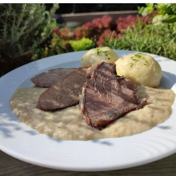 Tafelspitz mit Kräutersosse aus dem Hausgart’l mit gegrilltem Frischgemüse und Kartoffeln